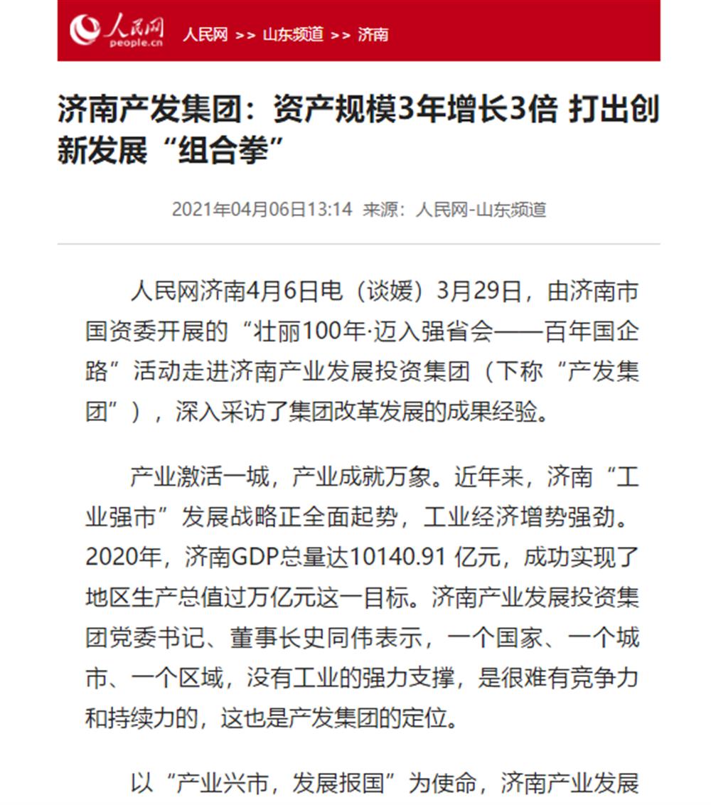 近日,市國資委舉辦的“壯麗100年·邁入強省會——百年國企路”媒體團一行到訪濟南產(chǎn)發(fā)集團后,人民網(wǎng)、大眾網(wǎng)、閃電新聞、濟南電視臺、濟南日報、帶濟南等多家國家、省市級媒體聚焦報道了集團改革發(fā)展的成果經(jīng)驗。
